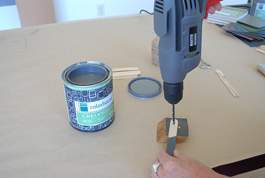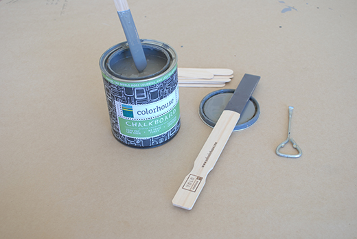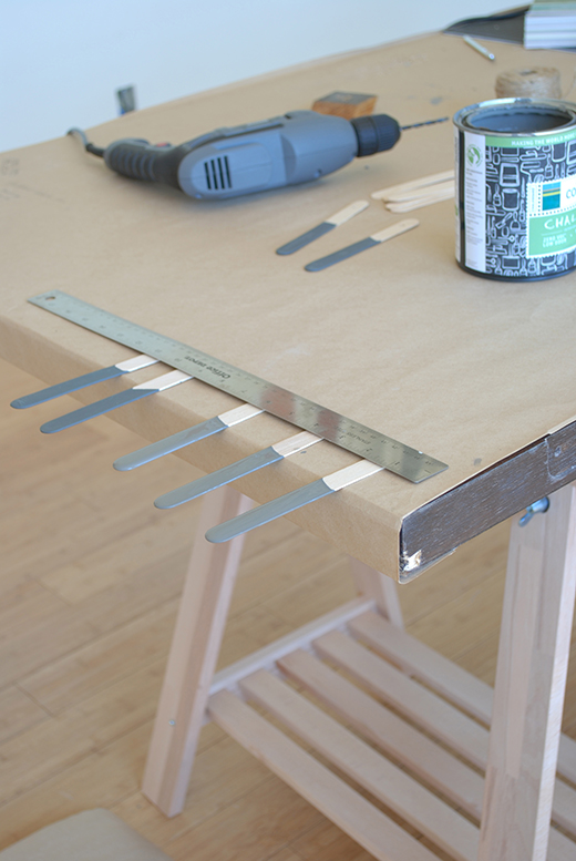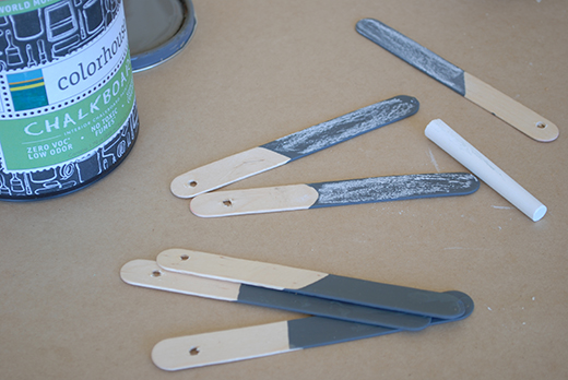 Step 1 – Dip the sticks in the chalkboard paint about halfway, letting excess paint drip off in the can.