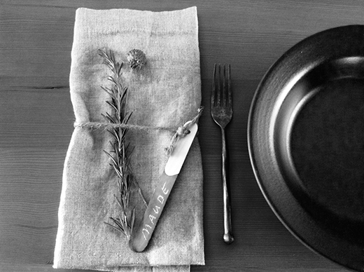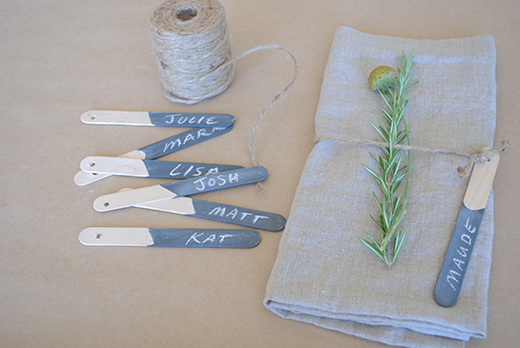 Step 6- Take the twine and tie the placeholders to your napkins. Adorn with sprigs of fresh herbs.